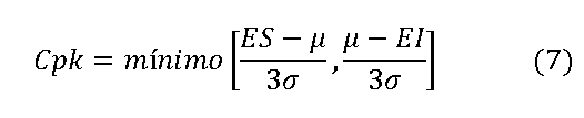 Si un proceso normal está en control estadístico, el 99.73% de las partes fabricadas estará comprendida entre 𝜇−3𝜎 y 𝜇+3𝜎. El parámetro 𝜇 depende del punto en el que se centra el proceso; sin embargo, 𝜎 depende del número y de las causas comunes de su variabilidad y por lo tanto, es intrínseca a este; 6𝜎 es la variabilidad natural del proceso o capacidad del proceso. Uno de los indicadores más utilizados para medir la capacidad, es el índice Cpk que se calcula como sigue; se define como un proceso capaz aquel cuyo Cpk >1 [6].