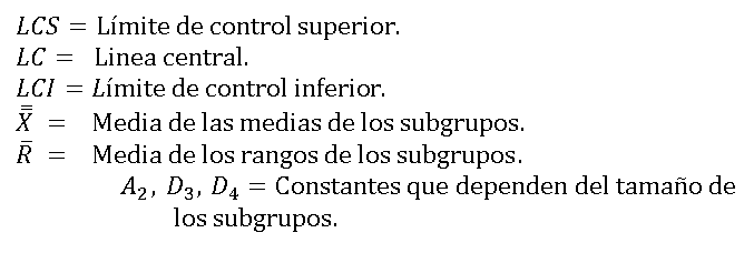 La carta X̅-R se aplica a procesos que producen grandes cantidades de productos o partes, donde la característica de calidad de interés es de tipo continuo o mediciones. En realidad, son dos cartas que se deben analizar juntas: la carta X̅ y la carta R; mediante la primera se controla la tendencia central de la característica y mediante la segunda se controla su variabilidad [4].
