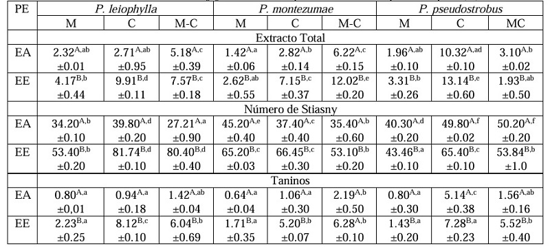 Extracto total. La Tabla 1 resume los resultados obtenidos y se observan diferencias significativas (p < 0.05), entre los métodos de extracción, subproductos y las especies de pino. La cantidad de extracto total obtenido fue de 1.42 % (madera de P. montezumae, extracción acuosa) a 13.14 % (corteza de P. pseudostrobus, extracción etanólica) ( Tabla 1) y en general se observó que el proceso de extracción con etanol (1:1) rindió mayores valores en comparación con la extracción acuosa, lo que coincide con la literatura [ 16, 17, 18]. Para la corteza de P. leiophylla, se reporta 19.11 % de extracto etanólico y 7.35 % de extracto acuoso [ 16], valores superiores a los aquí encontrados. En otra investigación [ 19] se ha dado a conocer un valor de 4.27 % de extracto acuoso en muestras de corteza de Pinus spp., valor que cae dentro del rango aquí obtenido (2.71 % a 10.32 %). En cuanto a la madera, la cantidad de extracto total acuoso de P. leiophylla es superior al reportado (1.30 %) para madera de esta misma especie y en relación a la madera de P. montezumae se encontró un valor igual (1.4 %) en madera de esta misma especie [ 20].