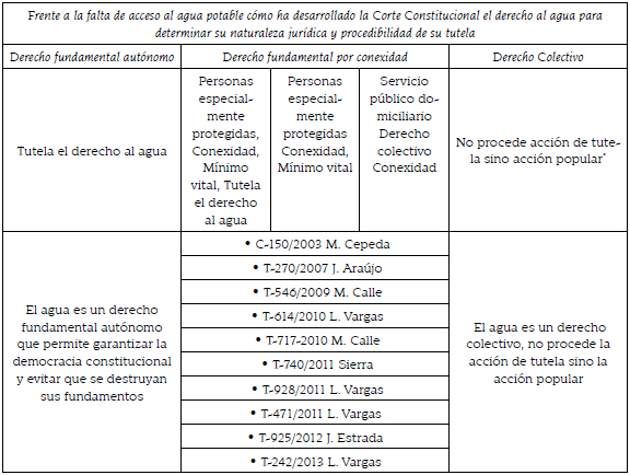 En términos generales cuando se vulnera el acceso al derecho al agua, la Corte ha establecido que: 1. El agua es derecho fundamental cuando se destina para el consumo humano en cuanto contribuye a la salud y salubridad pública; por ejemplo en las sentencias de la Corte Constitucional colombiana T–578 de 1992 y T–413 de 1995; 2. El agua es indispensable para el desarrollo de otros derechos fundamentales como la salud y la vida en condiciones dignas, como se observa en las sentencias T–578 de 1992 y T–881 de 2002, y 3. No se puede suspender el servicio público de acueducto cuando se afectan personas en estado de debilidad manifiesta, de acuerdo con la sentencia C–150 de 2003.