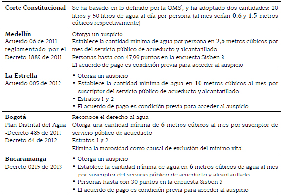 En Colombia se han establecido varias cantidades como mínimo vital de agua potable desde diferentes entes públicos como se indica en la tabla 3. La medida que ha establecido la Corte no se ha aplicado porque la empresa prestadora, cuando cumple con la orden de no suspensión, lo hace cambiando la forma de prestar el servicio suministrando al usuario cantidades mínimas de agua que implican la reducción del aforo y, por lo tanto, la disminución de la presión del agua; también se resumen las principales características de las normas que entregan una cantidad de agua gratuita a parte de la población. Se observa que solo en Bogotá hay una concepción universalista de la aplicación del derecho al mínimo vital de agua no solo porque reconoce el derecho al agua tanto en sus fundamentos jurídicos como en sus disposiciones sino porque elimina la morosidad como causal de exclusión del derecho. Por el contrario, en los demás municipios es muy marcada la posición de que se trata de un programa de asistencia social que otorga un auspicio a un sector de la población que cumple unos requisitos, entre ellos, no estar en mora con la empresa prestadora.