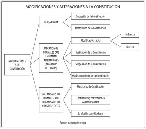 Dado que las tres grandes formas de alteraciones a la Constitución poseen características diferentes no pueden agruparse en un solo esquema de conjuntos, por lo cual cada una será organizada respectivamente, en un cuadro en razón a la modificación que le da origen.