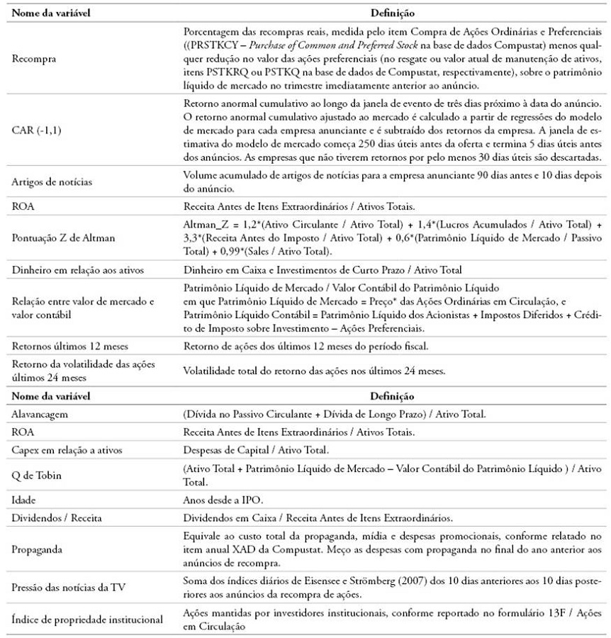 Para definir a variável dependente, Recomprai, sigo a literatura anterior (por exemplo, Yook, 2010; Nguyen, 2013; Bhattacharya & Jacobsen, 2015) e utilizo o Compustat, item Compra de Ações Ordinárias e Preferenciais (PRSTKCY na base de dados Compustat).
