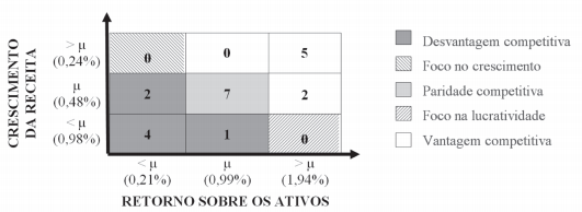 Em seguida, os 21 bancos da amostra foram classificados em três grupos para cada indicador, baseados no teste t de diferença de média, com significância de 5%, ou seja, acima da média, dentro da média e abaixo da média. A matriz de competitividade de Brito e Brito (2012) divide a amostra em nove quadrantes, baseados na classificação de cada banco quanto ao crescimento das vendas e ao ROA. A análise da matriz, conforme mostrado na Figura 1 (discutida na seção de resultados), permitiu classificar os bancos em três grupos com relação à competitividade: vantagem competitiva, paridade competitiva e desvantagem competitiva. O desempenho competitivo (COMPET) foi operacionalizado pela média aritmética dos scores padronizados na distribuição z de crescimento da receita e ROA.