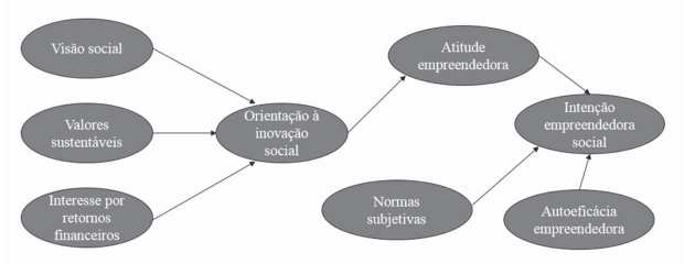 Resultados: Os resultados mostraram a influência positiva dos valores sociais na orientação à inovação social, levando em consideração a influência dos interesses financeiros. A orientação à inovação social, a atitude empreendedora social, a autoeficácia empreendedora e as normas subjetivas foram identificadas como preditoras da intenção empreendedora social.