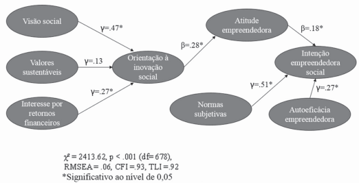 Os resultados para o modelo estrutural mostraram um ajuste de modelo aceitável, χ² = 2413,62, p < 0,001 (df = 678), RMSEA = 0,06, CFI = 0,93 e TLI = 0,92. O exame dos parâmetros individuais mostrou a influência significativa dos valores da visão social e do retorno financeiro sobre a orientação à inovação social, γ = 0,47 p < 0,001; E γ = 0,27, p < 0,001, respectivamente, suportando as hipóteses 1 e 3. A influência dos valores sustentáveis não foi significativa, γ = 0,13, p = 0,16, não apoiando a hipótese 2. A orientação para a inovação social teve uma influência positiva na atitude social empreendedor, ββ = 0,28, p < 0,001, apoiando a hipótese 4. Os efeitos das normas subjetivas, da atitude empreendedora social e da autoeficácia empreendedora na intenção empreendedora social foram significativos, γ= 0,51 p < 0,001; P = 0,18, p < 0,001; τ = 0,27, p < 0,001, apoiando as hipóteses 5, 6 e 7. Quanto aos efeitos indiretos, os resultados mostraram a influência positiva do interesse nos retornos financeiros e na visão social sobre a atitude do empreendedorismo social, 0,07, p < 0,001 e 0,10, p < 0,001. A influência dos valores de sustentabilidade na atitude do empreendedorismo social não foi significativa, 0,04 p = 0,17. Por fim, a influência indireta da orientação à inovação social nas intenções foi significativa, 0,05 p < 0,001.