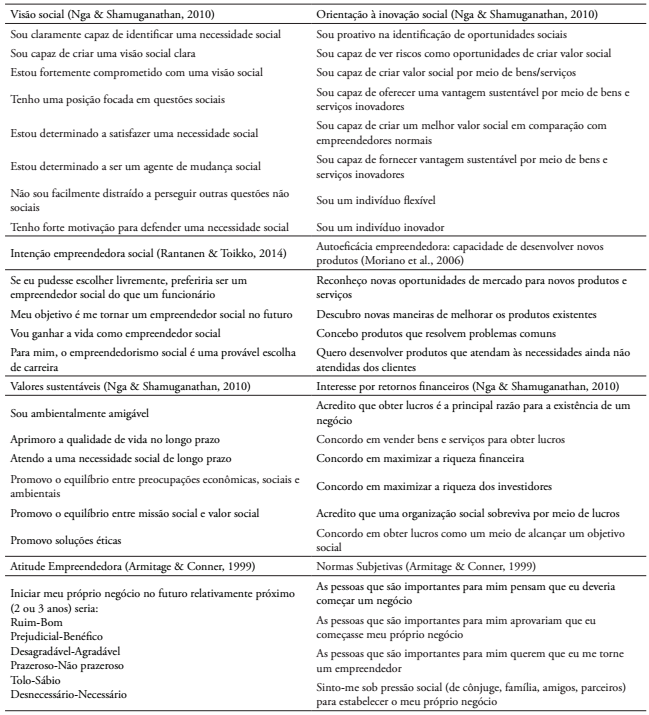 Orientação à inovação social (Nga & Shamuganathan, 2010). Esta escala tem oito itens que medem a orientação à inovação social. Os escores da escala mostraram níveis aceitáveis de consistência interna α = 0,93.