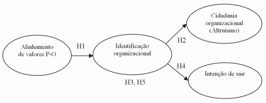 Ao encontrar parte de seu referencial identitário na organização, o destino do indivíduo e o da empresa ficam entrelaçados pela relevância desse sentimento de pertencimento, o que gera força e intensidade ao vínculo entre indivíduo e organização (Ashforth & Mael, 1989; Mael & Ashforth, 1992). Assim, na medida em que o pertencimento se torna um elemento definidor de si mesmo para o indivíduo, a força da identificação com a empresa ampliaria seu desejo de permanecer a ela vinculado (Dutton et al., 1994). Pesquisas de campo realizadas em diferentes contextos têm sugerido que a identificação organizacional reduz a intenção de funcionários de deixarem as empresas e sua rotatividade voluntária (ex.: Cavazotte, Oliveira & Miranda, 2010; Mael & Ashforth, 1995; Van Dick et al., 2004). Ainda, tendo em vista que o alinhamento de valores pessoa-organização também está associado à rotatividade (Kristof-Brown et al., 2005), são propostas as seguintes hipóteses: