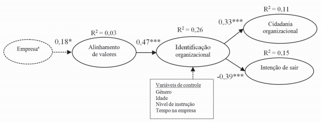 Conforme esperado, o alinhamento de valores teve um efeito positivo e estatisticamente significante na identificação organizacional (βAV-ID = 0,47; p < 0,001), dando suporte empírico a H1. A identificação organizacional teve uma influência direta e positiva no comportamento de cidadania organizacional (altruísmo) e na intenção do funcionário de sair da empresa (transferência). O efeito estimado da identificação no altruísmo foi positivo e estatisticamente significante (βID-CO = 0,33; p < 0,001), e o efeito estimado da identificação na intenção de transferência foi negativo e estatisticamente significante (βID-IS = -0,39; p < 0,001). Dessa forma, conclui-se que as hipóteses H2 e H4 obtiveram suporte empírico no estudo. O alinhamento de valores também apresentou efeitos indiretos similares e significantes nas variáveis cidadania organizacional e intenção de sair da empresa (βAV-IO-CO = 0,15; βAV-IO-IS = -0,17; p < 0,001), assim confirmando as hipóteses H3 e H5. Observou-se, desse modo, que o efeito do alinhamento de valores nos comportamentos de interesse se dão por via da maior identificação organizacional dos funcionários com suas respectivas empresas.