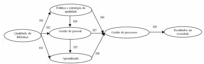 Por outro lado, os resultados mostram que os antecedentes da gestão de processos são a política e estratégia de qualidade (H6), gestão de pessoal (H7) e aprendizado (H8), que têm um efeito direto e positivo na gestão de processos. Esses resultados são corroborados por Eskildsen e Dahlgaard (2000), Calvo-Mora et al. (2005), Chinda e Mohamed (2007) e Tarí et al. (2007). Há também uma relação de interdependência entre a política e o planejamento e a gestão de pessoal (H4) e desta com o aprendizado (H5), o que está em linha com outros estudos (Calvo De Mora et al., 2005, Eskildsen & Dahlgaard, Et al., 2003, Samson & Terziovski, 1999, Tarí et al., 2007). Por fim, a relação entre gestão de processos e resultados na sociedade (H9) é globalmente embasada em estudos de Bou-Llusar et al. (2005) e Tarí et al. (2007).