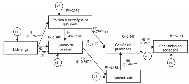 Todas as hipóteses propostas no modelo são empiricamente validadas por coeficientes padrão significativos, exceto pela relação entre liderança e aprendizado (H3) que se perde, resultado oposto ao obtido por Tarí et al. (2007). Esse resultado pode ter se dado porque, no setor de habitação rural, o número de funcionários é muito limitado, de forma que a liderança não é importante para estabelecer a política de qualidade e planejamento, além de práticas de gestão de pessoal e não influencia diretamente o processo de aprendizado, que é influenciado pela gestão de pessoal.