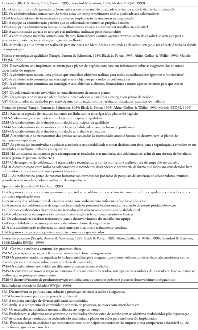 Para a elaboração do questionário para mensuração de cada um dos fatores críticos considerados, foram consideradas escalas de medição criadas e validadas empiricamente por renomados pesquisadores no campo da qualidade, adaptadas ao setor (por exemplo, Grandzol & Gershon, 1998, Tarí, Molina e Castejón, 2007) (vide apêndice), de forma que a validade interna da escala seja garantida. Antes de enviar o questionário final, foram selecionados 20 sujeitos (gestores de empresas, amostra e especialistas na área da gestão da qualidade) e realizamos um pré-teste para confirmar a validade e clareza das questões. O instrumento foi revisto com base nas suas sugestões.