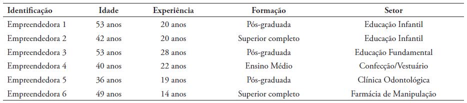 A escolha das participantes foi feita de forma propositada, conforme prevê a literatura (Creswell, 2010; Merriam, 2009), buscando-se a coerência interna exigida de uma pesquisa qualitativa, de forma a selecionar participantes que melhor possam ajudar a responder ao escopo da pesquisa. Para responder ao objetivo deste estudo procurou-se por empreendedoras experientes, proprietárias de negócios autossuficientes que fossem sua principal fonte de renda, que possuíssem experiência técnica ou administrativa anterior à criação de seu negócio e fossem responsáveis ou participantes da fundação das empresas que dirigem, e também por ampliação, inovação ou criação de novas unidades. Pelo conjunto de sua experiência profissional, podem ser consideradas empreendedoras experts, por atuar em setores de alta competição por pelo menos dez anos (Ramos, 2015). De acordo com a literatura citada no referencial teórico, seria esperado que empreendedoras iniciantes tenham medo em relação aseu negócio, e o foco deste estudo é compreender a existência do medo durante a trajetória empreendedora, e não apenas na fase inicial. O número de entrevistas não foi definido a priori, encerrando-se a etapa de coleta dos dados quando ficou evidenciada a saturação teórica, ou seja, os novos dados não acrescentaram novas categorias à pesquisa exploratória sobre o tema e as categorias começaram a se repetir. A Tabela 1 permite uma visão geral do perfil das participantes.