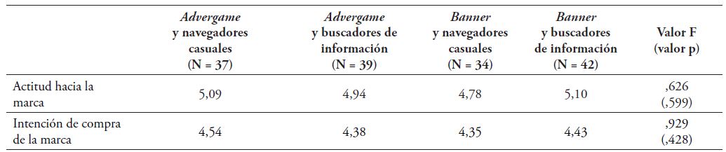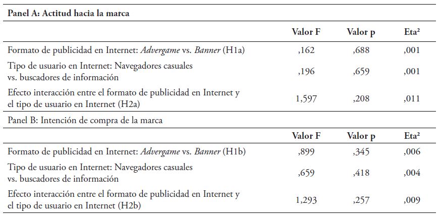 El análisis de varianza (ANOVA) fue utilizado por Jung et al. (2011) y ha sido ampliamente utilizado por otros investigadores en el análisis de la efectividad de los formatos publicitarios (e.g., Barone, Palan & Miniard, 2004; Farías, 2015; Manzur et al., 2012; Priester, Godek, Nayakankuppum & Park, 2004; White Nye et al., 2008; Yagci et al., 2009). Consecuentemente, se efectuaron ANOVAs 2 (formato de publicidad en Internet: advergame vs. banner) x 2 (tipo de usuario en Internet: navegadores casuales vs. buscadores de información) sobre las variables dependientes: actitud hacia la marca (calculada como el promedio simple de los 4 ítems utilizados para medir este constructo), e intención de compra de la marca (escala de un ítem utilizada para medir este constructo) para examinar las hipótesis 1 y 2 presentadas en esta investigación.