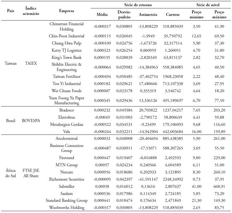 Nosso exame vai de 3 de janeiro de 2000 a 31 de dezembro de 2014 e cobre 3.913 dias de negociação para cada ação. Selecionamos as dez ações com maior volume de negociação em seu mercado nacional em 2000, desde que i) que a ação tenha sido registrada durante todo o período de exame e ii) que a ação tenha sofrido quaisquer desdobramentos durante o período de exame, visto que este é um fenômeno que prejudicaria gravemente os efeitos das barreiras em certos níveis. Uma vez que apenas quatro ações preencheram nossos critérios no índice brasileiro, nossa amostra é composta de 24 ações. Todos os dados foram recuperados da Thomson Reuters Datastream. As estatísticas resumidas sobre o preço das ações são apresentadas na Tabela 1, na qual é possível observar que as medidas de assimetria e curtose são geralmente inconsistentes com a normalidade.