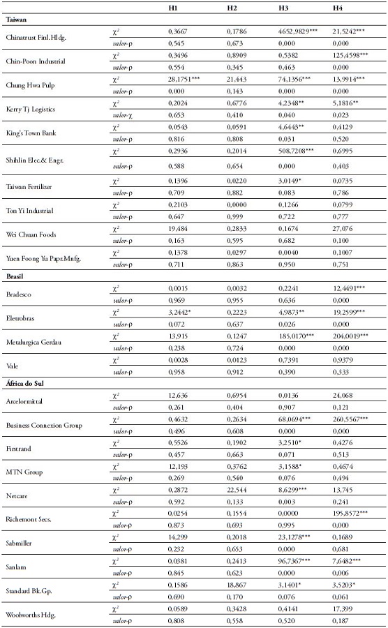A primeira hipótese, que testou as diferenças nos retornos médios condicionais antes e depois do cruzamento de uma barreira em movimento descendente, é rejeitada somente em um nível de 10% para duas ações em geral (Chung Hwa Pulp e Eletrobras), enquanto a segunda, que se concentra no movimento ascendente, não é rejeitada para nenhuma das ações.