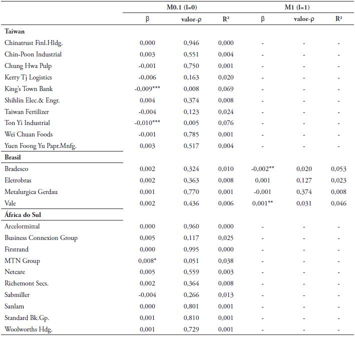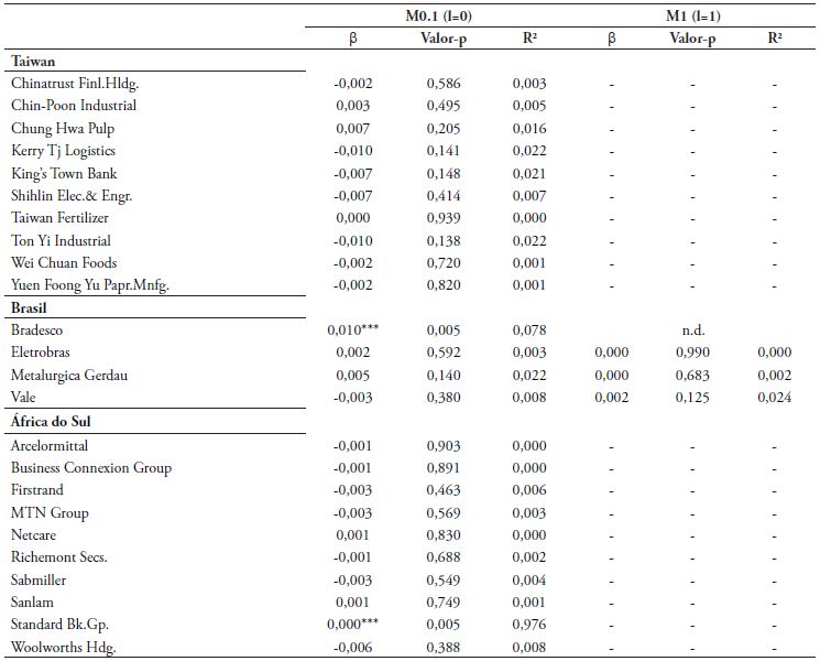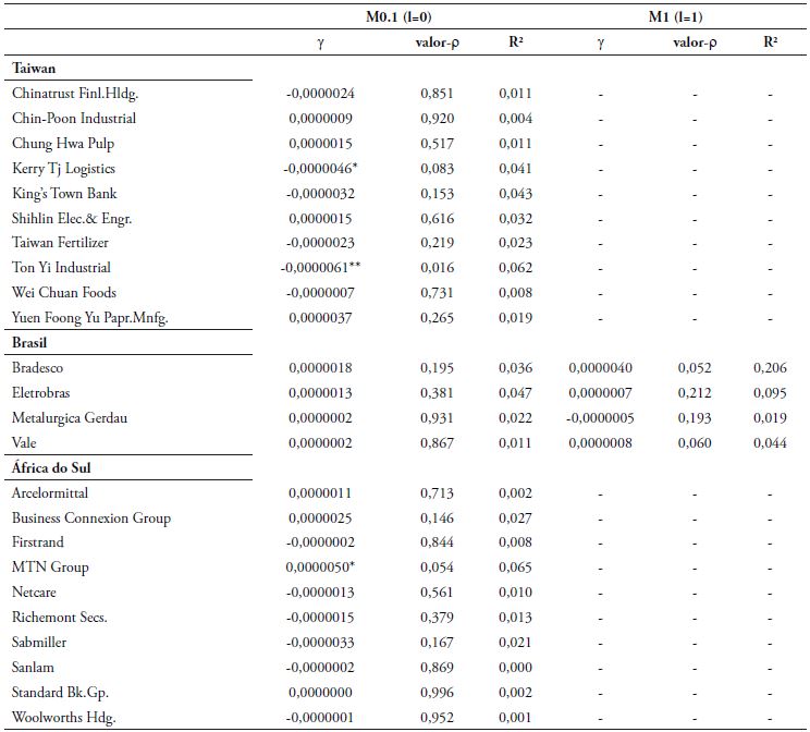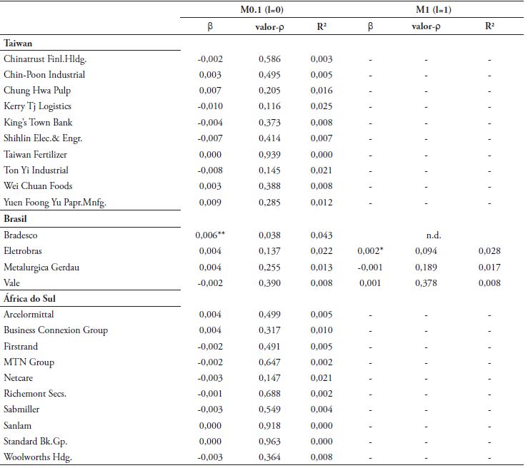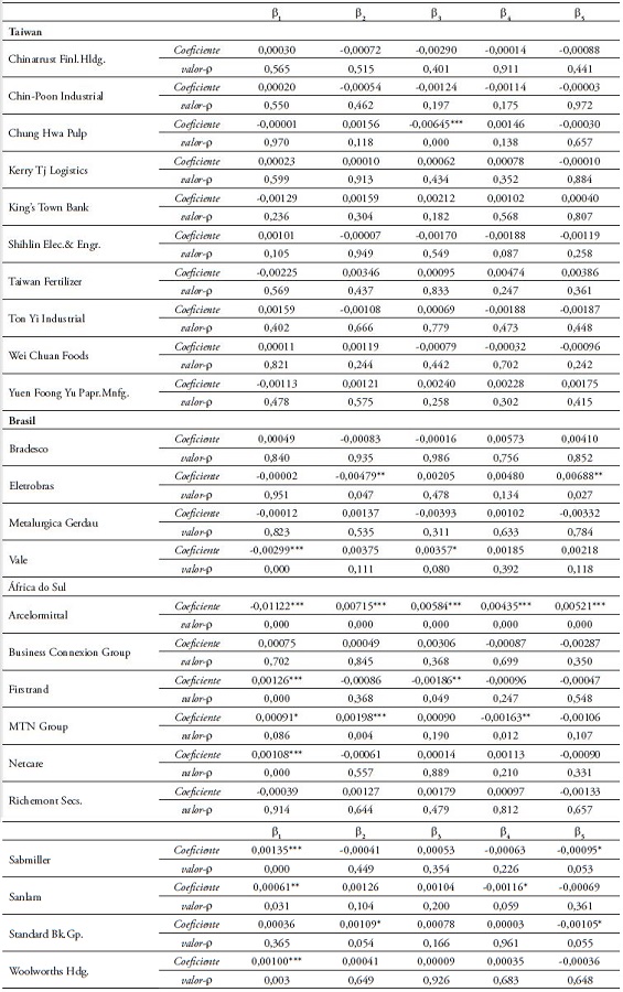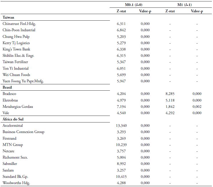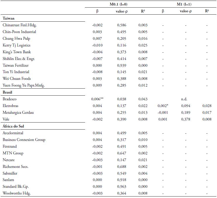 Assumindo a existência de barreiras psicológicas, esperamos que a dinâmica da série de retornos individuais seja diferente em relação a esses pontos. No entanto, os resultados da Tabela 8 não fornecem evidências claras de efeitos significativos em torno das barreiras, pois não existe um padrão claro de efeitos sobre os retornos de ações individuais antes e depois do cruzamento de uma barreira possível. Observamos, no entanto, que, em geral, a soma dos coeficientes em torno dos movimentos ascendentes é maior que a dos movimentos descendentes no Brasil, ao passo que, nas ações sul-africanas, ocorre o contrário. No caso das ações taiwanesas, não há evidências de uma reação diferente, quer o preço tenha movimento ascendente ou descendente em relação à barreira.