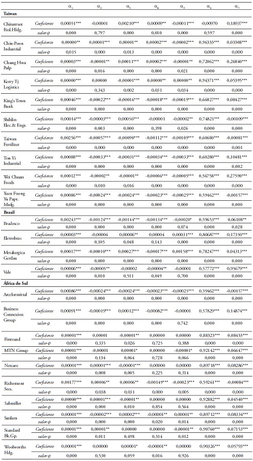Em geral, os resultados sugerem que as barreiras psicológicas não são um fenômeno importante nas ações individuais em estudo. Além de Ton Yi Industrial, King’s Town Bank e Bradesco, todas as outras ações não apresentam evidência consistente de uma barreira em torno de números redondos para todo o período de amostra. Os quadrados R são significativamente baixos, o que está de acordo com estudos anteriores que enfocavam os índices acionários.
