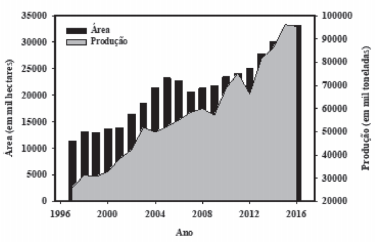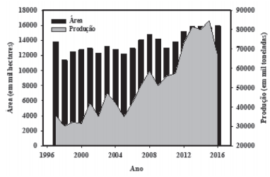 Em termos de produção, houve um incremento nos últimos anos. A produção brasileira de soja passou de 26.160 mil toneladas, na safra de 1997, para 95.434,60 mil toneladas, na safra de 2016, refletindo um aumento de 264,81% (Companhia Nacional de Abastecimento [Conab], 2017a). Em relação à área cultivada, no mesmo período, houve um acréscimo de 192,16%, passando de 11.381,3 mil hectares para 33.251,9 mil hectares (Conab, 2017a) (Figura 1).