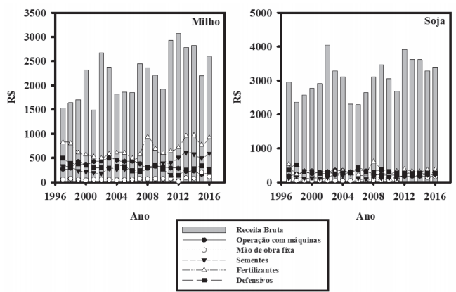Os custos de produção do milho e da soja estão representados na Figura 3, com a respectiva receita bruta-1, compreendendo o período de 1997 a 2016, dividido pelas variáveis: “operação com máquinas”, “mão de obra”, “sementes”, “fertilizantes” e “defensivos”. Entre os anos de 1997 a 2016, a receita bruta ha-1 da cultura do milho obteve acréscimo de 41,65% (sendo que entre o ano de 1997 a 2014 o acréscimo havia sido de 84,72%). Nesse período, em dois momentos, a cultura apresentou maiores oscilações no total dos custos variáveis: a) entre as safras 2007 a 2008 e b) entre as safras de 2012 a 2013, com 26,32% e 24,66%, respectivamente. Em relação à cultura da soja, o aumento da receita bruta ha-1 foi de 11,11% (tendo sido de 22,69% entre o ano 1997 a 2014). No período, o total dos custos variáveis oscilou entre os anos de 2007 a 2008, com incremento de 31,95%.