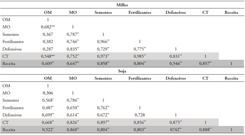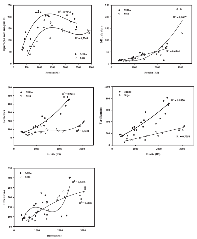 Os coeficientes de determinação para as variáveis dos custos de produção do milho são: a) “operação com máquinas”: 71,54%, b) “mão de obra”: 63,44%, c) “sementes”: 92,15%; d) “fertilizantes”: 85,70%; e) “defensivos”: 52,55%. Para a cultura da soja, os coeficientes de determinação são: a) “operação com máquinas”: 75,69%; b) “mão de obra”: 80,67%; c) “sementes”: 82,31%; d) “fertilizantes”: 72,54%; e e) “defensivos”: 66,87%. Os valores históricos de custos para essas variáveis foram proporcionais à receita bruta ha-1, podendo-se prevê-las e melhor predizê-las com a equação de regressão.