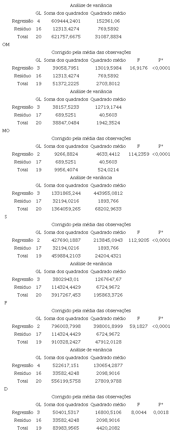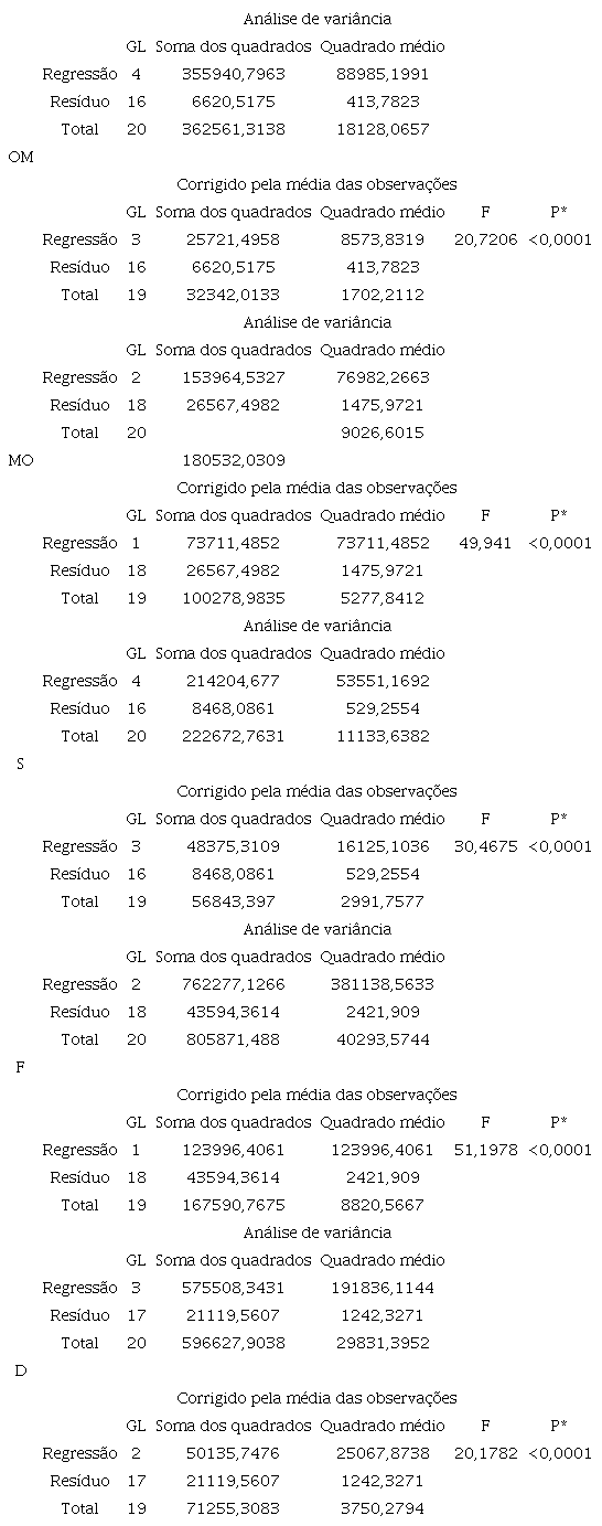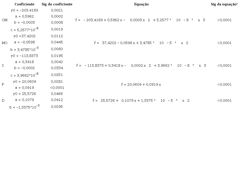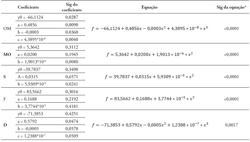 É possível inferir para a variável “fertilizante”, na cultura da soja, que, por apresentar correlação linear, a cada unidade de receita bruta ha-1 acrescida aumenta, de forma aritmética, 0,0919 unidade de custo. Para as demais variáveis, por não apresentarem linearidade, a predição da maximização dos lucros pode ser realizada, da mesma forma, por suas respectivas equações, a partir da determinação da receita e do custo (Tabelas 6 e 7). O método de regressão na análise de variância determinou se o modelo explica satisfatoriamente a relação entre as variáveis dos custos de produção com a receita bruta ha-1. Para tanto, o emprego do teste F determinou quais são as equações possíveis; e o coeficiente de determinação (R2) demonstrou o grau de explicação de cada equação. O teste F, na análise de variância, testou apenas o coeficiente associado à variável “receita bruta ha-1” em seu maior expoente, testando-se assim o efeito de grau p.