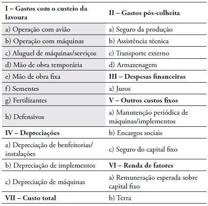 Os custos variáveis referem-se às despesas de custeio da lavoura (como operação com máquinas e implementos, despesas administrativas, sementes, fertilizantes e mão de obra e encargos trabalhistas) e despesas pós-colheita (por exemplo, assistência técnica e extensão rural, seguro agrícola, transporte externo e armazenagem). Nos custos fixos estão incluídas as depreciações de benfeitorias, instalações, máquinas e implementos, mão de obra e encargos trabalhistas e seguro do capital fixo. Os custos operacionais levam em consideração os custos variáveis, fixos e a remuneração esperada sobre o capital fixo e sobre a terra. Somando-se esses montantes, obtém-se o custo total de produção.