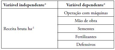 Com base no resultado do teste de normalidade, efetuou-se a análise de correlação. Para as variáveis paramétricas, calculou-se o coeficiente de correlação de Pearson (p). Para as variáveis não paramétricas, calculou-se o coeficiente de correlação de Spearman (r). O valor dos coeficientes pode assumir valores de -1 a 1. Quando a variável assume valor 1, significa que a correlação é positiva e perfeita; quando assume o valor de -1, significa que a correlação é negativa e perfeita, isto é, se uma variável aumenta, a outra diminui. Por fim, quando assume o valor 0, significa que as duas variáveis não apresentam correlação (Hair, Black, Babin, Anderson & Tatham, 2009). Para as variáveis que apresentaram correlação com a receita bruta ha-1, efetuou-se a regressão a fim de encontrar uma equação que explique a relação entre as variáveis dependente com a independente. A Tabela 2 descreve a variável independente e as variáveis dependentes.