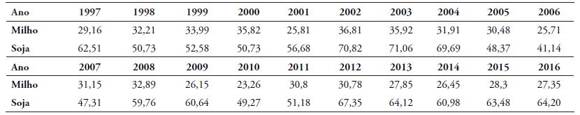 Para analisar o comportamento dos custos de produção da soja e do milho, utilizou-se o preço pago por saca de 60 kg, multiplicado pela produtividade (sc ha-1), resultando na receita bruta ha-1 (Tabela 3). Além disso, ressalta-se que o preço pago é refletido pelo mercado, existindo interação entre o mercado do milho e o da soja na formação do preço de ambas as commodities (Caldarelli & Bacchi, 2012).