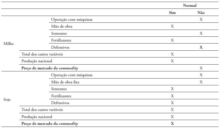 O conjunto de dados de cada variável foi testado a partir do teste de Kolmogorov-Smirnov (com nível de erro de 5%), a fim de analisar a normalidade dos dados. As variáveis consideradas paramétricas para cultura do milho são: a) “mão de obra”, b) “fertilizantes”, c) “custo total” e d) “produção nacional”. Em relação à cultura da soja, as variáveis consideradas paramétricas são: a) “sementes”, b) “fertilizantes”, c) “defensivos”, d) “custo total”, e) “produção nacional” e f) “preço de mercado”. A normalidade dos dados deve-se pela baixa dispersão (oscilação) dos valores históricos entre os anos de 1997 a 2016 (Tabela 4).