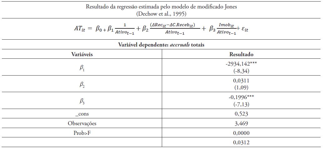 O primeiro passo do trabalho é analisar os resultados da regressão da qualidade da informação contábil medida por meio de gerenciamento de resultado, conforme modelo modificado de Jones (Dechow et al., 1995).