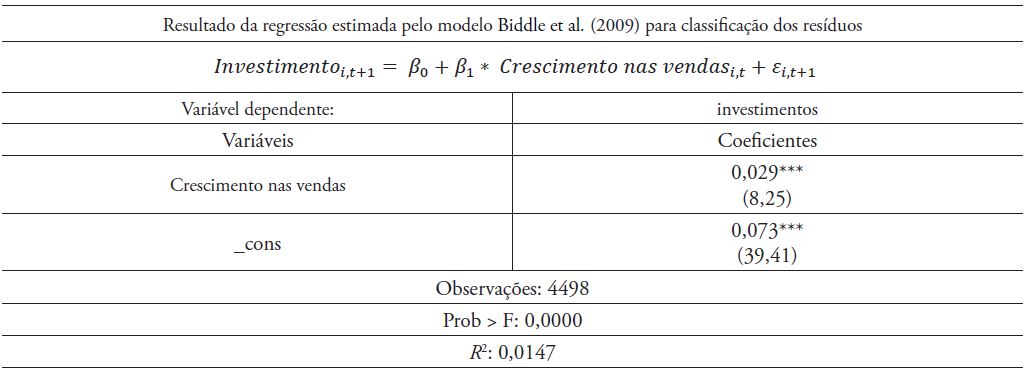 Biddle et al. (2009) destacam ainda que as empresas deverão ser classificadas com base na magnitude dos resíduos gerados pela equação, ou seja, desvios das previsões dos investimentos, que foram utilizados como variável dependente para análise da relação entre under/overinvest e gerenciamento de resultados.