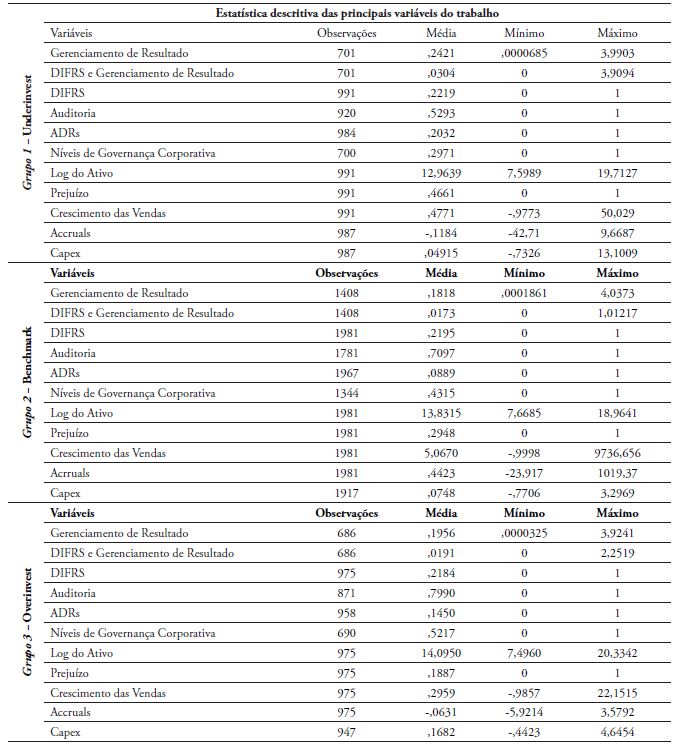 Metodologia: Primeiro estabeleceu-se o nível padrão (benchmark) da eficiência dos investimentos, analisando-se o nível de investimento e o crescimento nas vendas conforme demonstrado na Equação 1. Após essa categorização, os resultados dos quartis extremos, classificados como sobre/subinvestimento, foram utilizados como variáveis dependentes para análise da relação entre gerenciamento de resultado e investimento abaixo ou acima do previsível. Por fim, e para testar essa relação, utilizou-se uma regressão logística multinominal para avaliar a probabilidade de sobre e subinvestimentos em empresas que praticam gerenciamento de resultados comparadas ao benchmark.