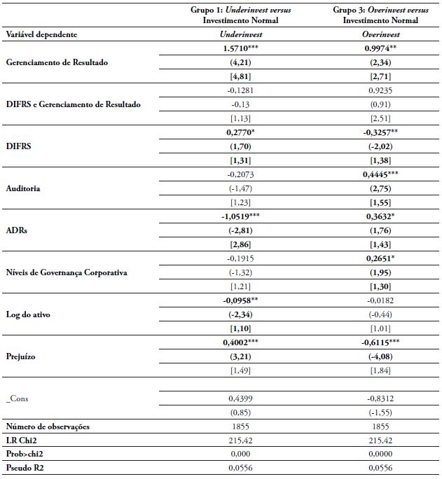 A partir dos resíduos acima, foram realizadas regressões multinominais para avaliar a relação entre gerenciamento de resultados, níveis de controle e probabilidade de empresas pertencerem ao grupo de sobreinvestimento ou subinvestimento, quando comparadas com as companhias classificadas no grupo referência, ou seja, benchmark.
