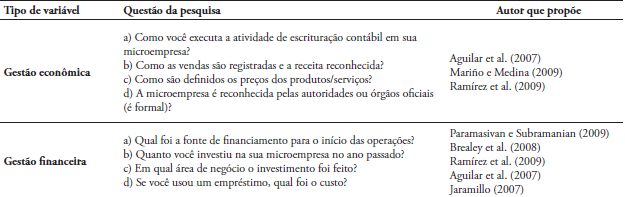 De acordo com a literatura, as variáveis que representam os fatores da EFM, tais como sistema de contabilidade, planejamento e alguns controles econômicos (Tabela 1), foram identificadas a partir de questões de pesquisa. As perguntas selecionadas foram as seguintes: a) Como você executa a atividade de escrituração contábil em sua microempresa? b) Como as vendas são registradas e a receita reconhecida? c) Como são definidos os preços dos produtos/serviços? e d) A microempresa é reconhecida pelas autoridades ou órgãos oficiais (é formal)? Os dados dessas questões foram transformados em variáveis independentes para representar a gestão econômica (ge).