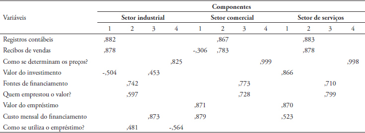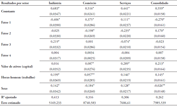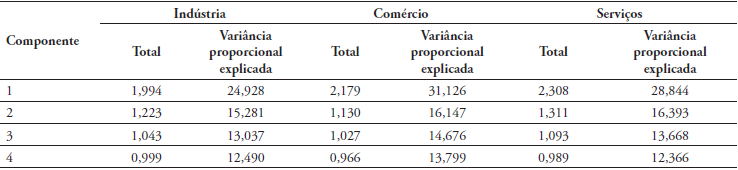 Como resultado da metodologia, obtém-se a contribuição dos fatores para explicar a variância total em cada um dos setores em análise, como mostra a Tabela 4. Os resultados sugerem que os quatro fatores explicam aproximadamente 65,7% da variância total para o setor industrial, 75,7% para o setor de comércio e 71,3% para o setor de serviços. O fator 1 contribui mais para explicar a variância total, representando entre um quarto e um terço dela. O valor do quarto fator é muito próximo de 1, explicando 12,5% da variância na indústria, 13,8% no comércio e 12,4% em serviços. Isso explica por que ele também é incluído na estrutura fatorial.