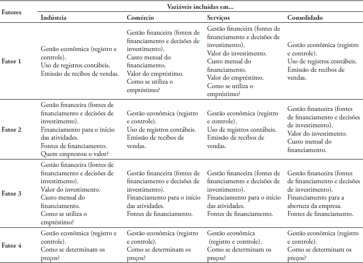 A seleção de fatores para substituir as variáveis originais foi realizada por meio da análise fatorial; esses fatores serão usados em um modelo de regressão para determinar a relação entre as variáveis e o desempenho da microempresa. Deve-se notar que as variáveis que representam os fatores de gestão econômico-financeira podem ser diferentes entre os três setores econômicos. Os fatores da Tabela 3, onde os fatores são exibidos para cada setor e o caso consolidado, são rotulados como gestão econômica (registro e controle) ou gestão financeira (fontes de financiamento e decisões de investimento).