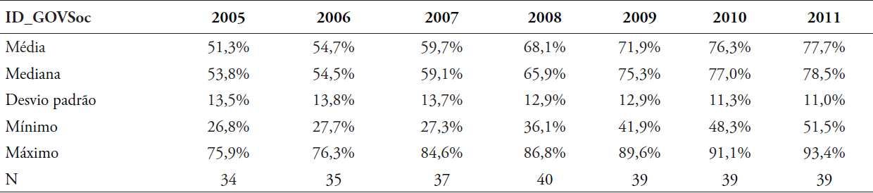 Como se observa na Tabela 1, Painel A, em 2005 o ID_GOVSoc varia entre 26,8% e 75,9%, com uma média de 51,3% e um desvio padrão de 13,5. O valor médio do índice ID_GOVSoc é crescente ao longo do período analisado, tendo alcançado um valor médio de 77,7% em 2011. Os valores obtidos indicam que as empresas revelam grande amplitude na divulgação das práticas de governança corporativa.