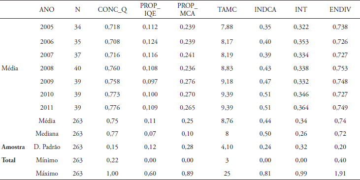 No Painel B, observa-se que a porcentagem média de ações detidas pelos acionistas com participações superiores a 2% do capital registra um valor médio significativo de 74,60%, sugerindo que as empresas que fazem parte da amostra apresentam níveis elevados de concentração da estrutura acionista. Além disso, a concentração média aumentou durante o período da amostra: de 71,8% em 2005 para 77,6% em 2011. A porcentagem de ações detidas pelos investidores estrangeiros registra um valor médio de 10,90%, embora o valor máximo de ações detidas por esses investidores, para uma empresa da amostra, tenha atingido os 60%. A participação dos administradores no capital social das empresas varia entre 0% e 89%, com um valor médio de 25,30%. Por sua vez, o número de membros do CA varia entre um mínimo de 3 e um máximo de 25, com uma média de 9 membros - um número, segundo Yermack (1996), próximo ao recomendado pelos estudos que associam o valor de mercado das empresas ao número de membros do CA. O grau de independência do CA aproxima-se dos 44%, tendo verificado um aumento considerável durante o período da amostra, passando de 35% em 2005 para 51% em 2011. O grau de internacionalização das empresas portuguesas evidencia grande amplitude, desde um valor mínimo de 0% e um valor máximo de 99,2%, registrando um valor médio de 34,15%. O nível de endividamento médio das empresas portuguesas analisadas é de 73,86%. Um nível elevado de endividamento pode indicar que existe pouco espaço para as empresas aumentarem o investimento.