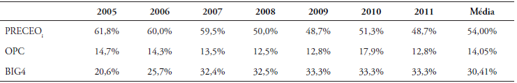 Constatou-se uma relação positiva e significativa (p < 0,005) entre o nível de DIEG e o fato de as empresas serem auditadas por uma das BIG4, o que nos permite confirmar a hipótese H2e. Os resultados sugerem que as empresas auditadas por uma BIG4 divulgam, em média, mais informação relativa à estrutura de governança (Barako et al., 2006). Nesse sentido, os dados deste estudo revelam que as empresas auditadas por uma BIG4 apresentam, em média, um índice de divulgação de informação sobre a estrutura de governança igual a 58,4% em 2005, e que atinge os 78,6% em 2011. Esses resultados são consistentes com os estudos de Oliveira et al. (2006) e Lopes e Rodrigues (2007) realizados no contexto português.