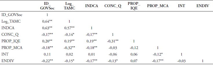 Os resultados da Tabela 2 mostram que a variável dependente ID_GOVSoc apresenta relações estatisticamente significativas com as variáveis caracterizadoras da estrutura de gestão das empresas. Em geral, os coeficientes de correlação estimados indicam que o problema da colinearidade entre as variáveis poderá não assumir particular relevância no presente estudo. Para avaliar a associação entre as variáveis qualitativas PRECEO, OPC e BIG4, foi aplicado o teste da independência do Qui-quadrado, que não rejeitou a hipótese de independência entre as variáveis.