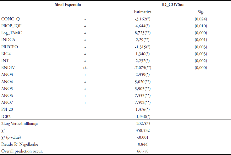 À semelhança de outros autores, como Franck e Sundgren (2012) e Costa et al. (2013), realizou-se um modelo de regressão ordinal logística, com base em um pool de dados, controlando os efeitos para os anos em análise, procurando analisar a significância de cada variável que entra no modelo de regressão e suprimindo as variáveis de controle sem capacidade explicativa significativa. Um resumo dos resultados obtidos a partir do pool de dados é evidenciado na Tabela 3. O Pseudo R2 de Nagelkerke indica que as variáveis independentes explicam 84,4% da variação do ID_GOVSoc.