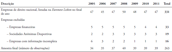 A população deste estudo é composta por empresas de capital aberto, não financeiras, com ações listadas na Euronext Lisbon, que divulgaram suas demonstrações contábeis e/ou relatórios de governança corporativa relativas ao período de 2005 a 2011. Excluíram-se todas as Sociedades Anônimas Desportivas porque seu exercício contábil é distinto do das demais listadas e ainda das empresas financeiras, em razão de sua estrutura de capital circulante e por estarem sujeitas a mecanismos adicionais de governança corporativa impostos pelo regulador. A amostra final utilizada na pesquisa compreende um total de 263 observações para 40 empresas diferentes, como descreve o quadro constante do Anexo I.