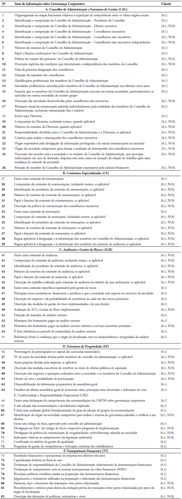 O índice de divulgação (ID_GOVSoc) é composto por um conjunto de 82 itens de informação agrupados em seis categorias principais, a saber: CA e estrutura de gestão, comissões especializadas (remuneração e nomeação), auditoria e gestão de riscos, estrutura de propriedade, conformidade e responsabilidade empresarial e transparência financeira. A lista de itens incluídos no índice de divulgação é desenvolvida no Anexo 2. Para tornar a análise de conteúdo mais rigorosa e confiável, foi identificado o significado de cada um dos itens que compõem o índice de divulgação e procedeu-se ao registro da informação obtida por meio da análise de conteúdo em uma tabela construída para esse fim.