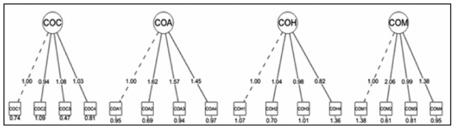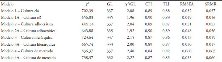 Em seguida à AFC dos construtos, são propostos quatro modelos concorrentes (1, 2, 3 e 4), tendo cada modelo uma das dimensões da cultura. Para cada modelo concorrente foi gerado um modelo alternativo (1A, 2A, 3A e 4A), no qual foram mantidos todos os itens e incluídos os cálculos dos estimadores da covariância dos erros entre variáveis observadas de um mesmo construto latente que apresentaram o poder de reduzir o valor da estatística χ2 em um valor maior do que 10. Esse ajuste estatístico tem a vantagem de manter as relações previamente estabelecidas e melhorar a modelagem com a manutenção dos itens mensurados empiricamente (Hair et al., 2009; Marôco, 2010). Assim, nos Modelos 1A e 2A foram incluídos estimadores das covariâncias dos erros entre os itens SRC1 e SRC2, SRC2 e SRC3, além de SRC2 e SRC4. No Modelo 3A, entre os itens COH1 e COH3, SRC1 e SRC2, SRC2 e SRC4, além de CI2 e CI4. Por fim, no Modelo 4A, entre os itens COM1 e COM2, COM2 e COM3, COM2 e COM4, SRC1 e SRC2, além de SRC2 e SRC4. Entre os modelos estimados, a adequação dos parâmetros ocorreu nos Modelos 1A (cultura clã) e 2A (cultura adhocrática), com ambos apresentando valores limítrofes no CFI (0,90) e muito próximos da zona de adequação para o TLI (0,89).