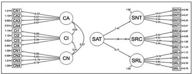Os demais índices para esses modelos se mostraram adequados, como RMSEA e SRMR. Já os Modelos 3A e 4A apresentam os indicadores fora dos parâmetros que permitam analisar os estimadores das relações entre as variáveis latentes. Com respeito aos estimadores das relações entre os construtos cultura, satisfação e as dimensões de comprometimento, a Figura 4 apresenta os estimadores para o Modelo 1A (cultura clã) e a Figura 5 apresenta os estimadores para o Modelo 2A (cultura adhocrática).