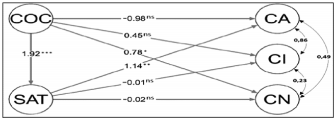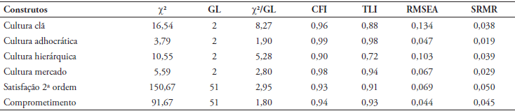 Os resultados da AFC indicam que os fatores latentes gerados a partir dos itens da cultura clã e hierarquia não apresentam todos os indicadores dentro dos parâmetros de adequação do modelo. Esse resultado indica que, nesse contexto, os elementos dessas culturas apresentam considerável variabilidade entre os respondentes. Já os fatores construídos a partir dos itens de cultura adhocrática e mercado, além do construto satisfação em 2ª ordem e comprometimento em 1ª ordem, apresentam os parâmetros dentro dos valores esperados, indicando melhor adequação ao modelo proposto.