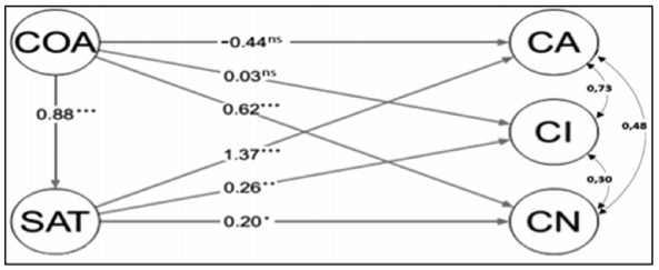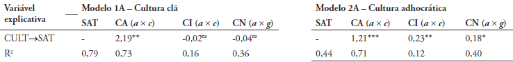 O Modelo 1A, apresentado na Figura 4, mostra a satisfação bem explicada no modelo (R2 = 0,79) com o estimador da cultura clã com relação positiva (β = 1,92). Assim, espera-se que um aumento da presença dos elementos da cultura clã eleve a satisfação no trabalho. Um aumento na presença dos elementos de cultura clã (β = 0,78) também leva a um aumento do comprometimento normativo (CN). Para o comprometimento, somente a dimensão afetiva (CA) apresentou relação positiva com a satisfação (β = 1,14). Ainda no Modelo 1A, ao analisar a cultura clã mediada pela satisfação (Tabela 3), esta passa a ter uma influência positiva (β = 2,19) e significativa em CA, indicando que, em uma situação de satisfação no trabalho, um aumento dos elementos da cultura clã leva a um maior comprometimento afetivo, o que não ocorre ao se levar em consideração somente a cultura. Essa mesma mediação da satisfação na cultura não gera estimadores significantes no CI e também no CN.