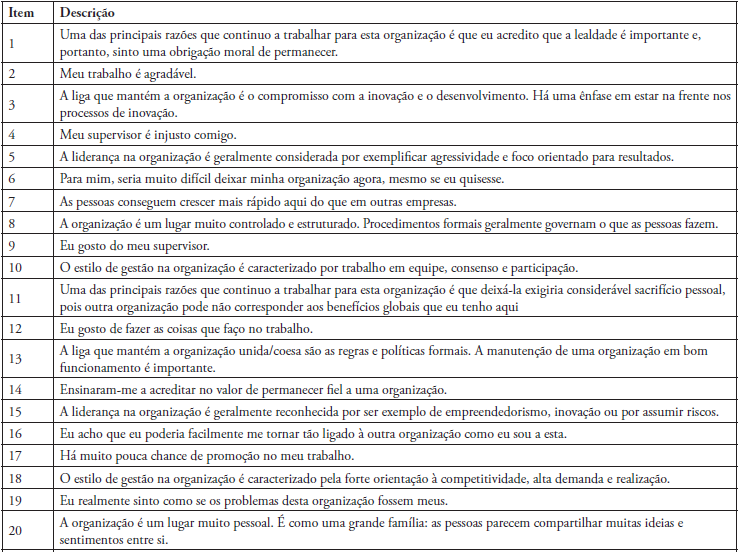 Ainda que exista uma quantidade significativa de definições e abordagens sobre cultura, utilizou-se nesta pesquisa a abordagem de Cameron e Quinn (2006, p.17) para os quais “a cultura de uma organização se reflete nos estilos de liderança dominantes, na linguagem e nos símbolos, nos procedimentos e rotinas, e nas definições de sucesso que fazem uma organização única”. Com objetivo de mensurar a cultura organizacional de uma organização, esses autores utilizam o Instrumento de Avaliação da Cultura Organizacional (OCAI - sigla em inglês) que deriva do Competing Values Framework (CVF) de Quinn e Rohrbaugh (1983).