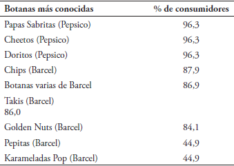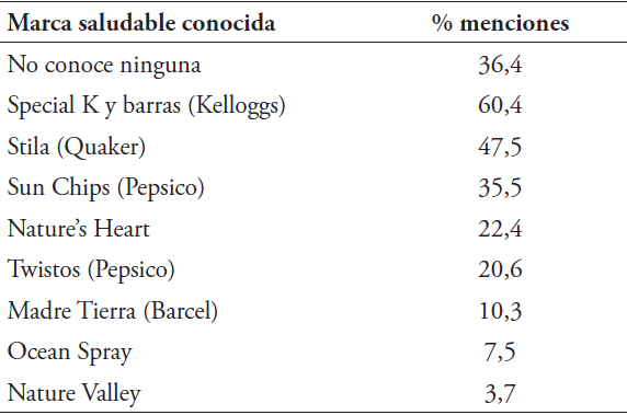 La información de la primera sección del cuestionario se utilizó para indagar sobre qué marcas de botanas se reconocen como saludables, los atributos nutricionales deseables y no deseables para estas botanas y su grado de importancia para el consumidor. La Tabla 1 indica las marcas de botanas saludables que el consumidor reconoció de forma espontánea.
